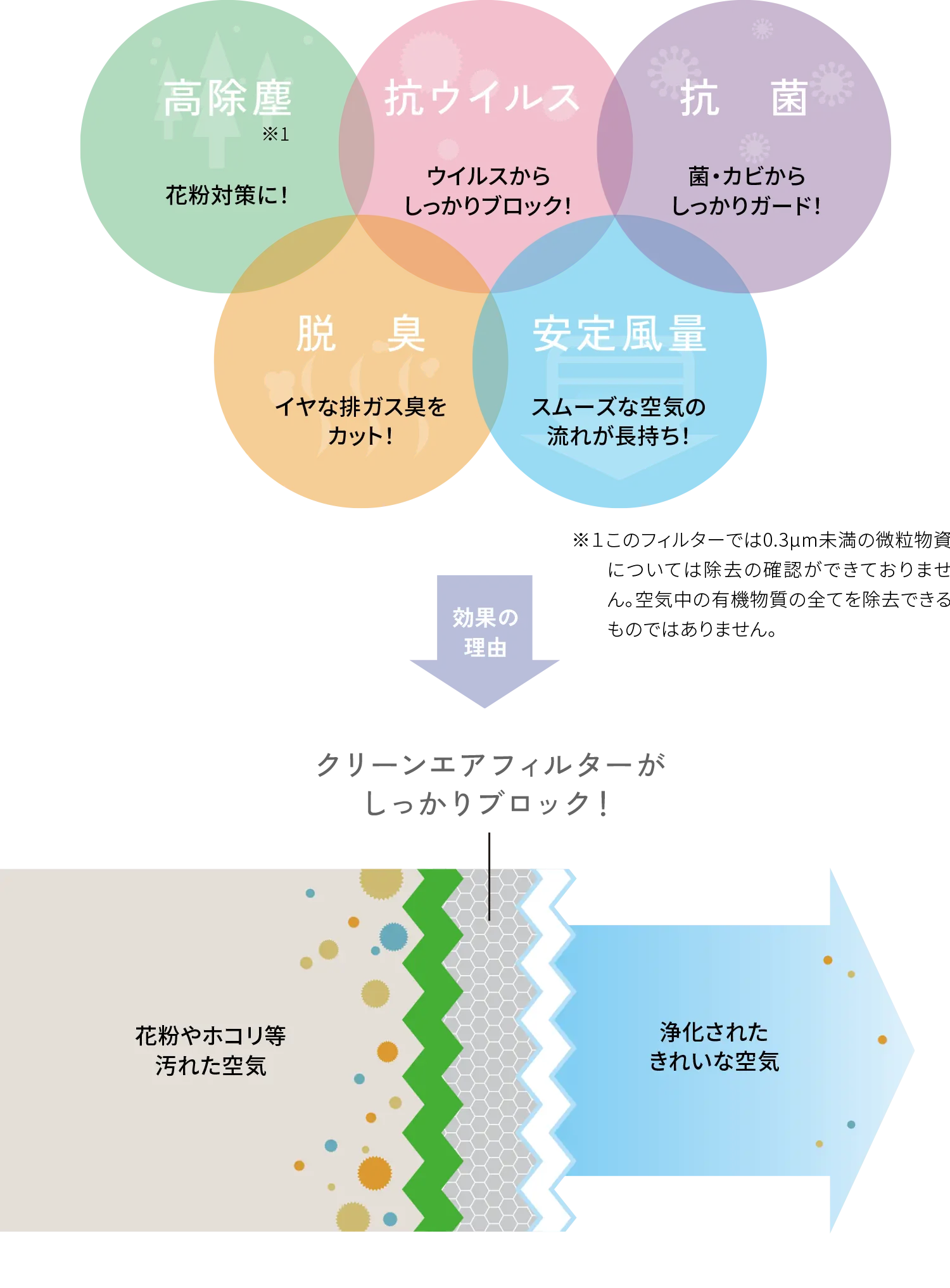 ※4:このフィルターでは0.3μm未満の微粒子物質については除去の確認ができていません。