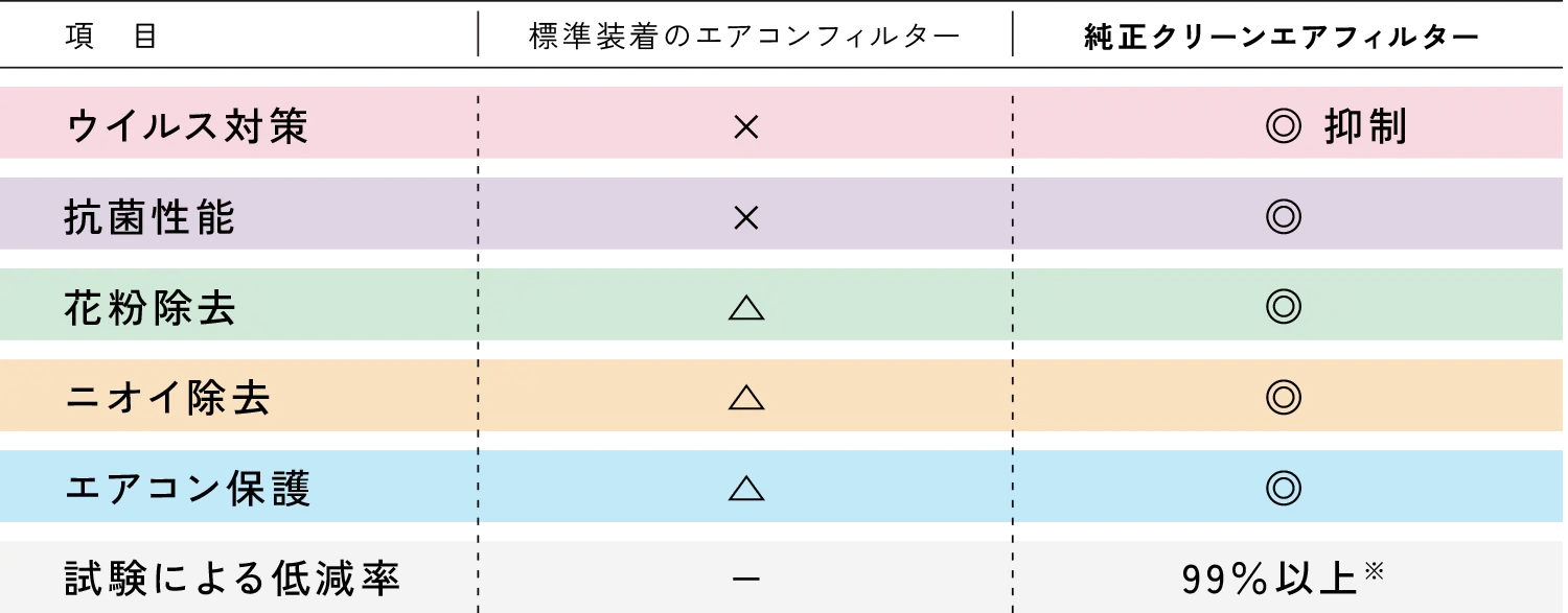 車外からのスギやヒノキなどの花粉のほか、黄砂・チリ・ホコリ・微粉塵などをフィルターでキャッチします。
