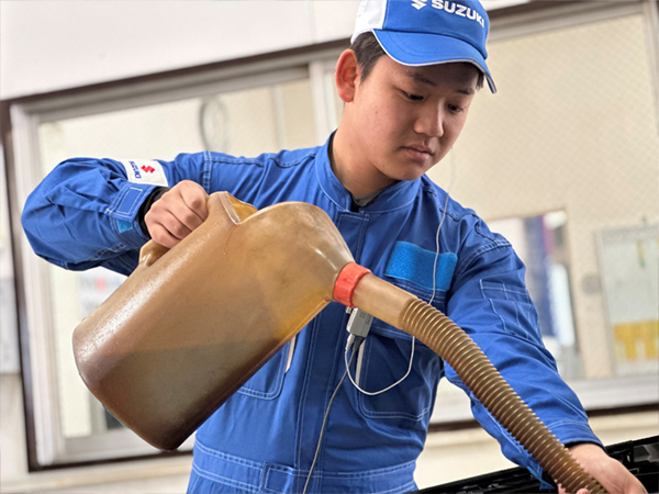 エンジンオイル交換作業で『ECSTAR F』を充填している様子(右写真)。