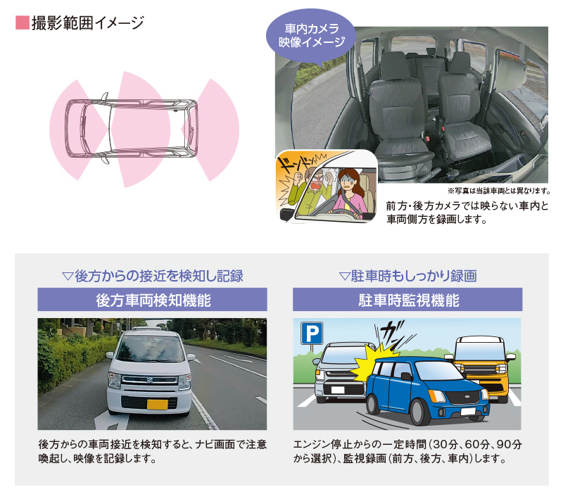 ナビ連動タイプのドライブレコーダーはドライブレコーダー単体ではご利用できません。対応ナビセットと組み合わせてご使用ください。取り付ける車両とドライブレコーダーの組み合わせによって、全方位モニター付メモリーナビゲーション(メーカーオプション)装着車、全方位モニター付ディスプレイオーディオ(メーカーオプション)装着車、バックアイカメラ付ディスプレイオーディオ(メーカーオプション)装着車には装着できません。