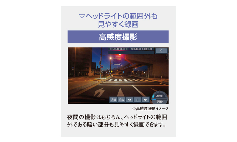 ナビゲーションと接続せず、ドライブレコーダー単体で使用できるタイプです。
