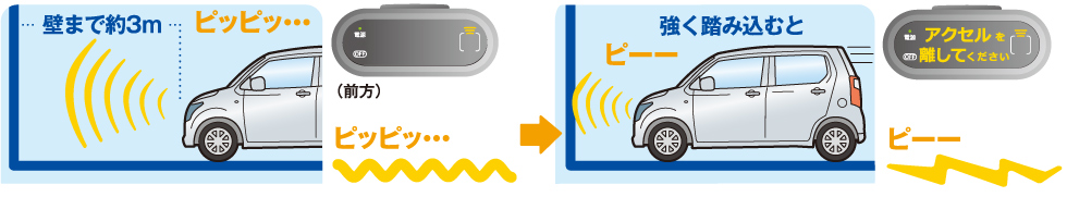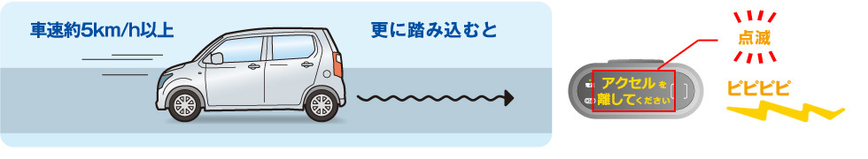 駐車場での後退時など、車速が約5km/hになってもアクセルを踏み続けるか約5km/h以上で更にアクセルを踏み込むと障害物がなくても