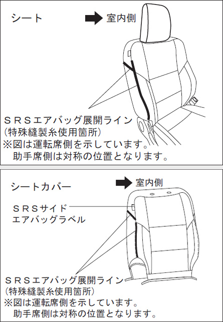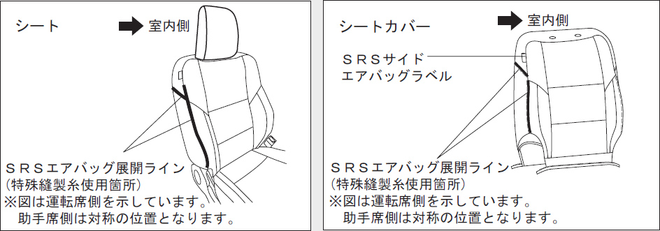 スズキ純正シートと同様の基準で、様々な使用環境におけるエアバッグ展開の試験を行っております。SRSサイドエアバッグ展開ラインに特殊縫製糸を使用しており、シート内蔵エアバッグ展開時には糸が切れシート内蔵エアバッグが正しく展開します。