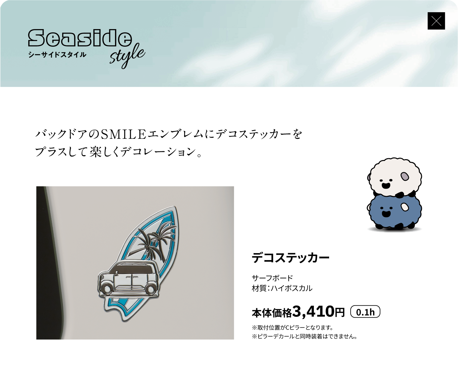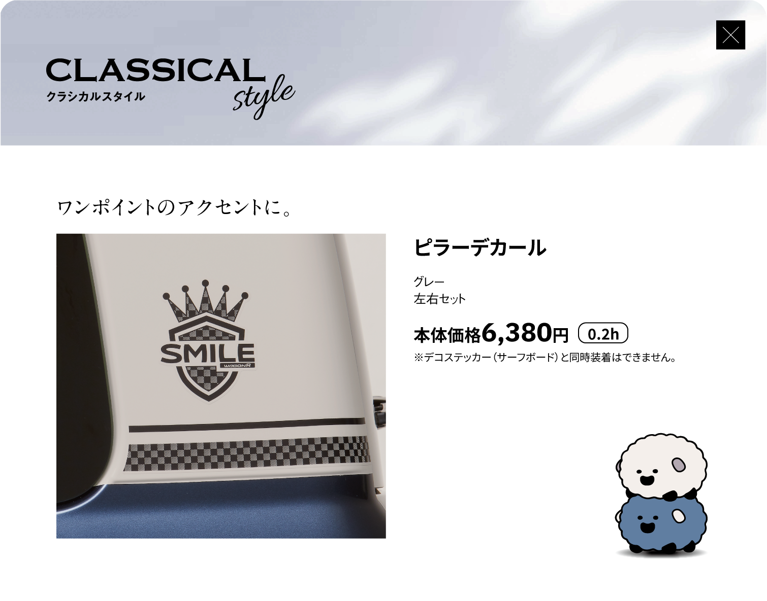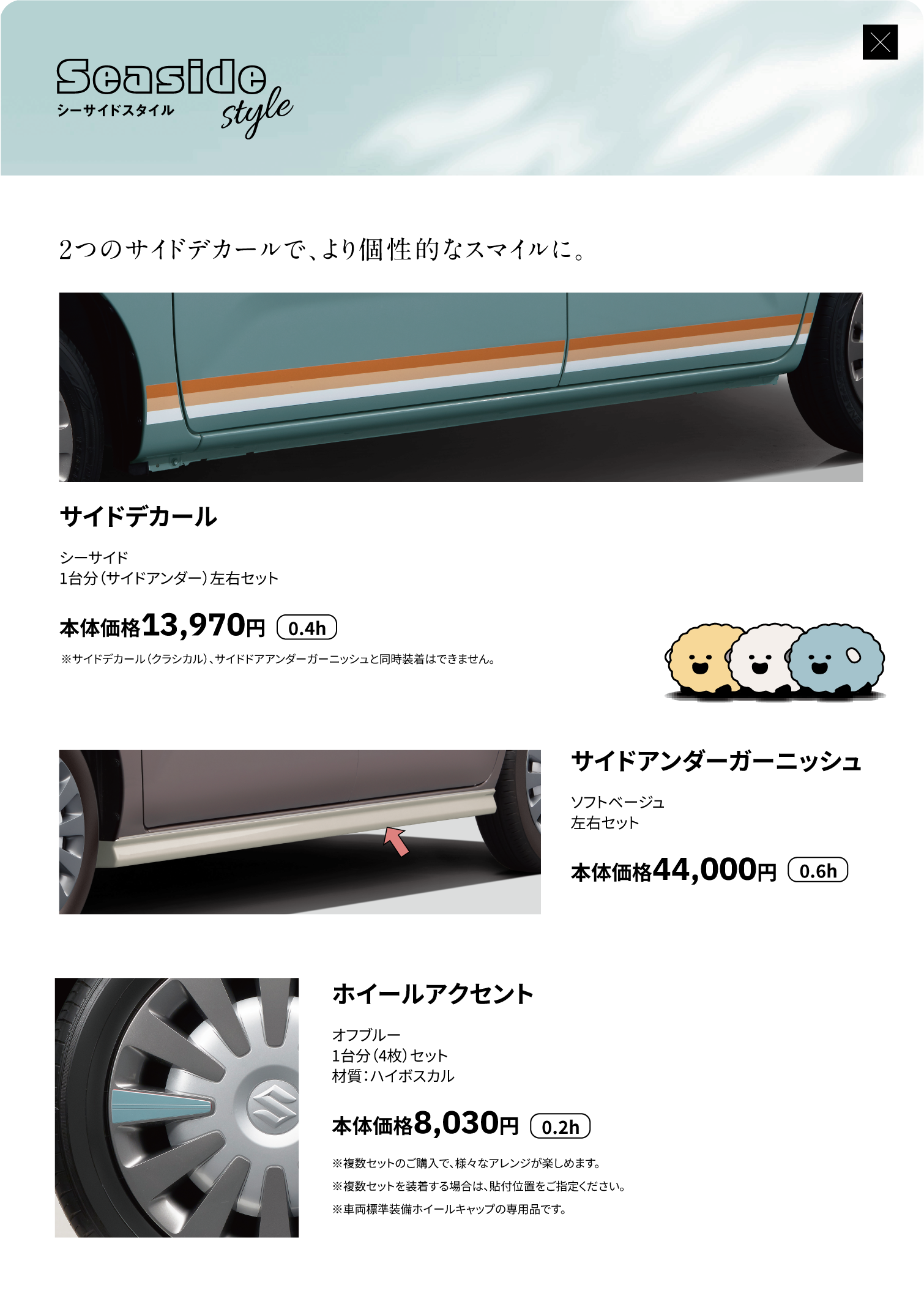 フードデカール、ピラーデカール、サイドデカール(ピンストライプ)、サイドデカール、フロントアンダーガーニッシュ、サイドアンダーガーニッシュ、リヤアンダーガーニッシュ、アルミホイール(14インチ)、アルミホイールセンターキャップ