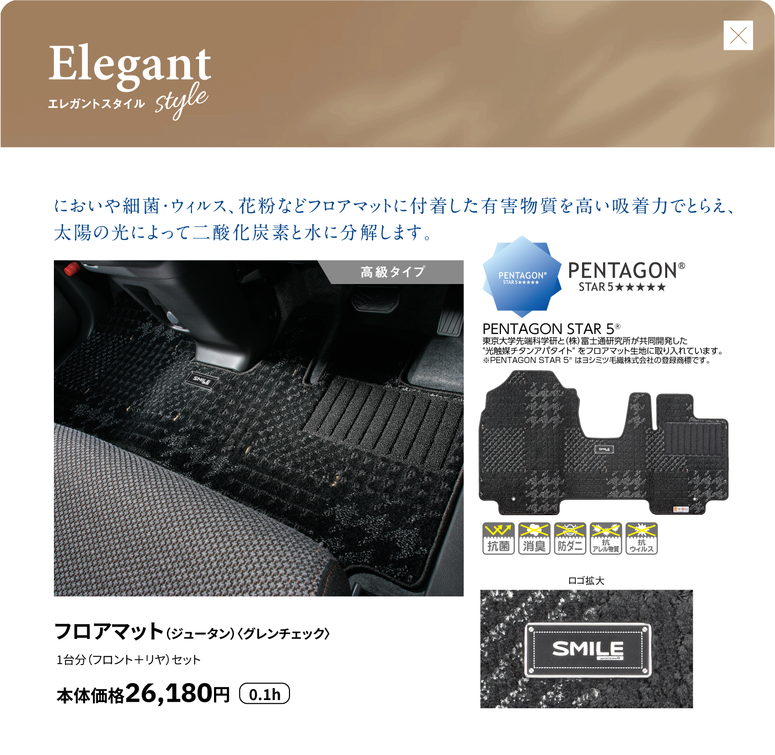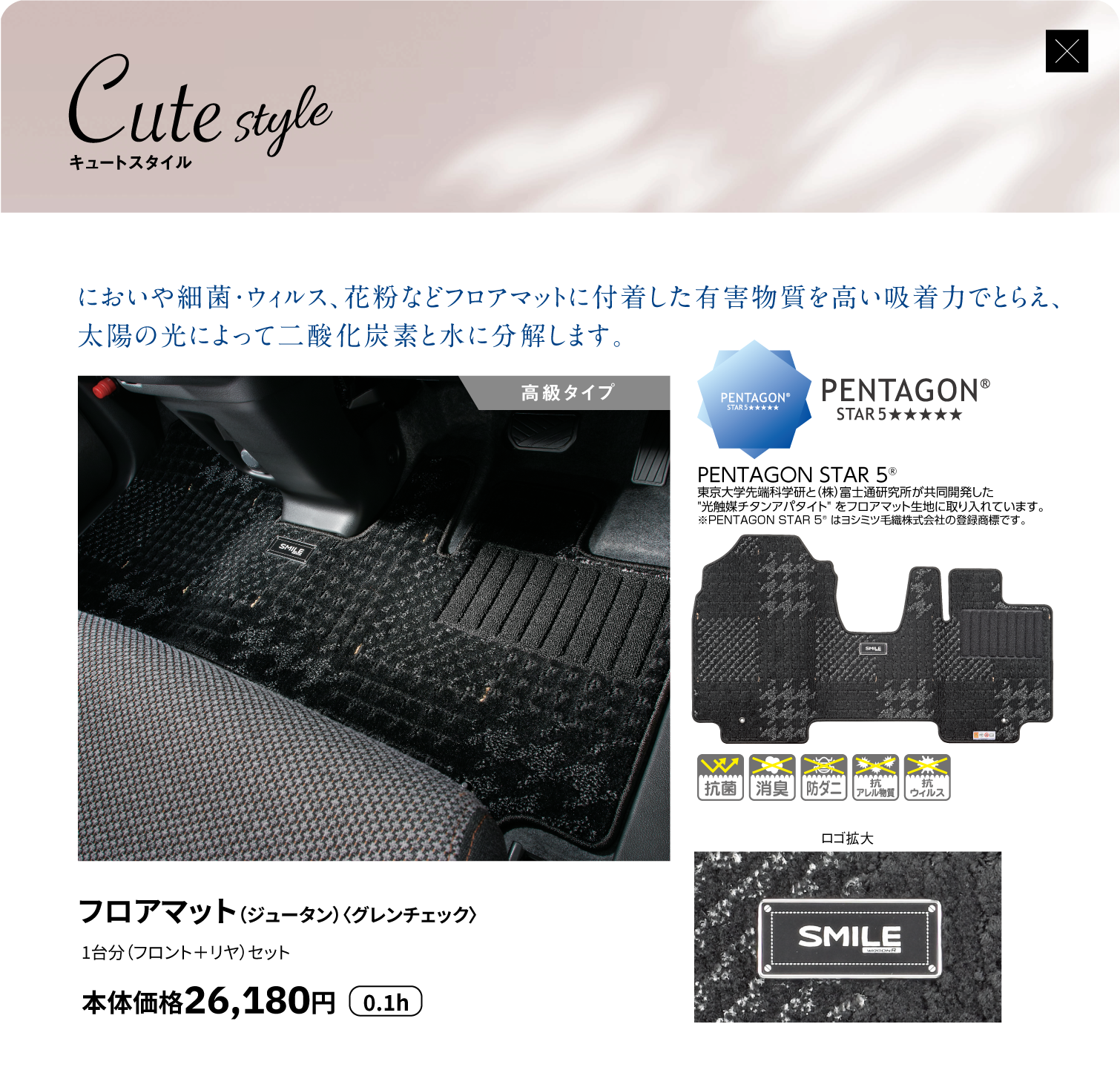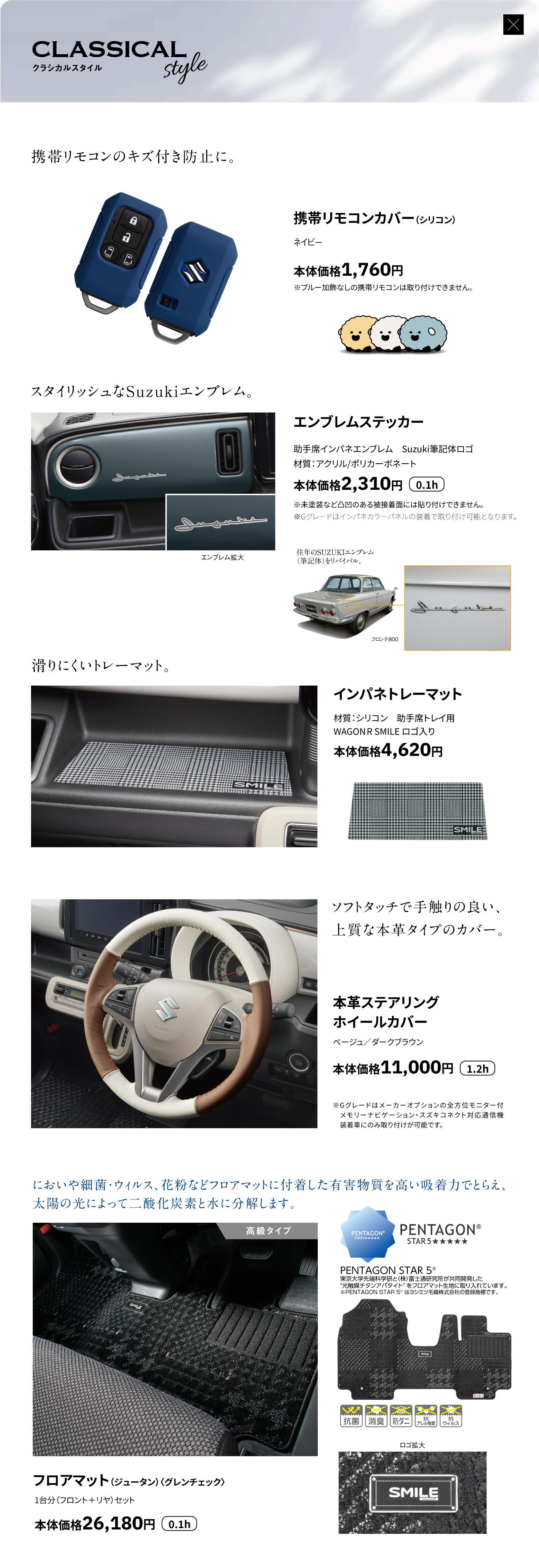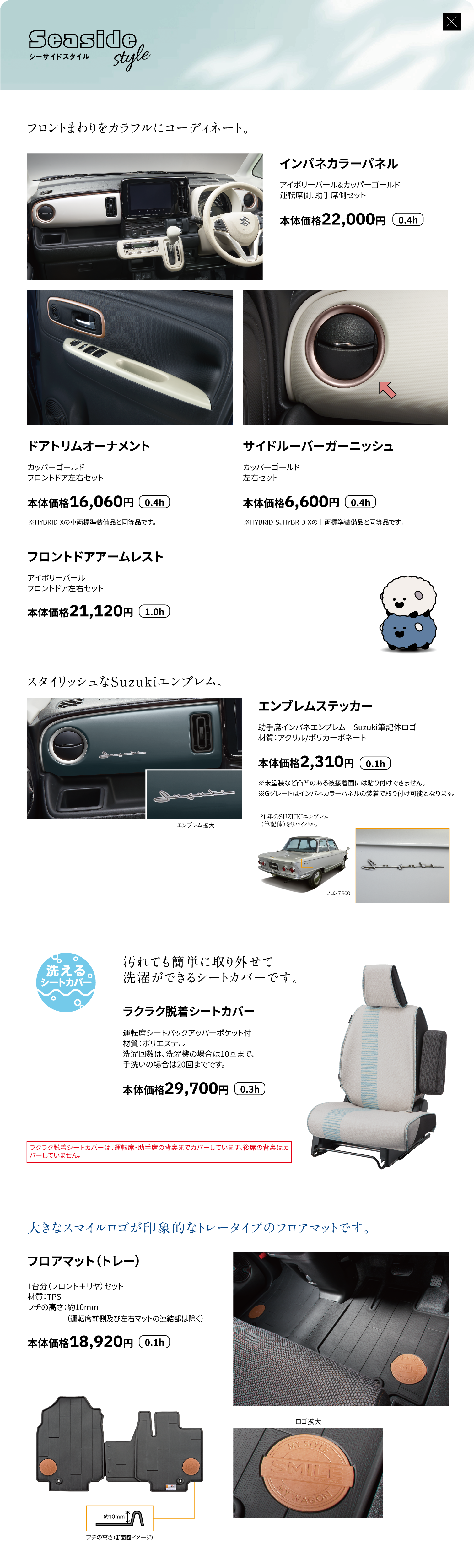 インパネカラーパネル、ドアトリムオーナメント、フロントドアアームレスト、サイドルーバーガーニッシュ、エンブレムステッカー、ラクラク脱着シートカバー、フロアマット(トレー)