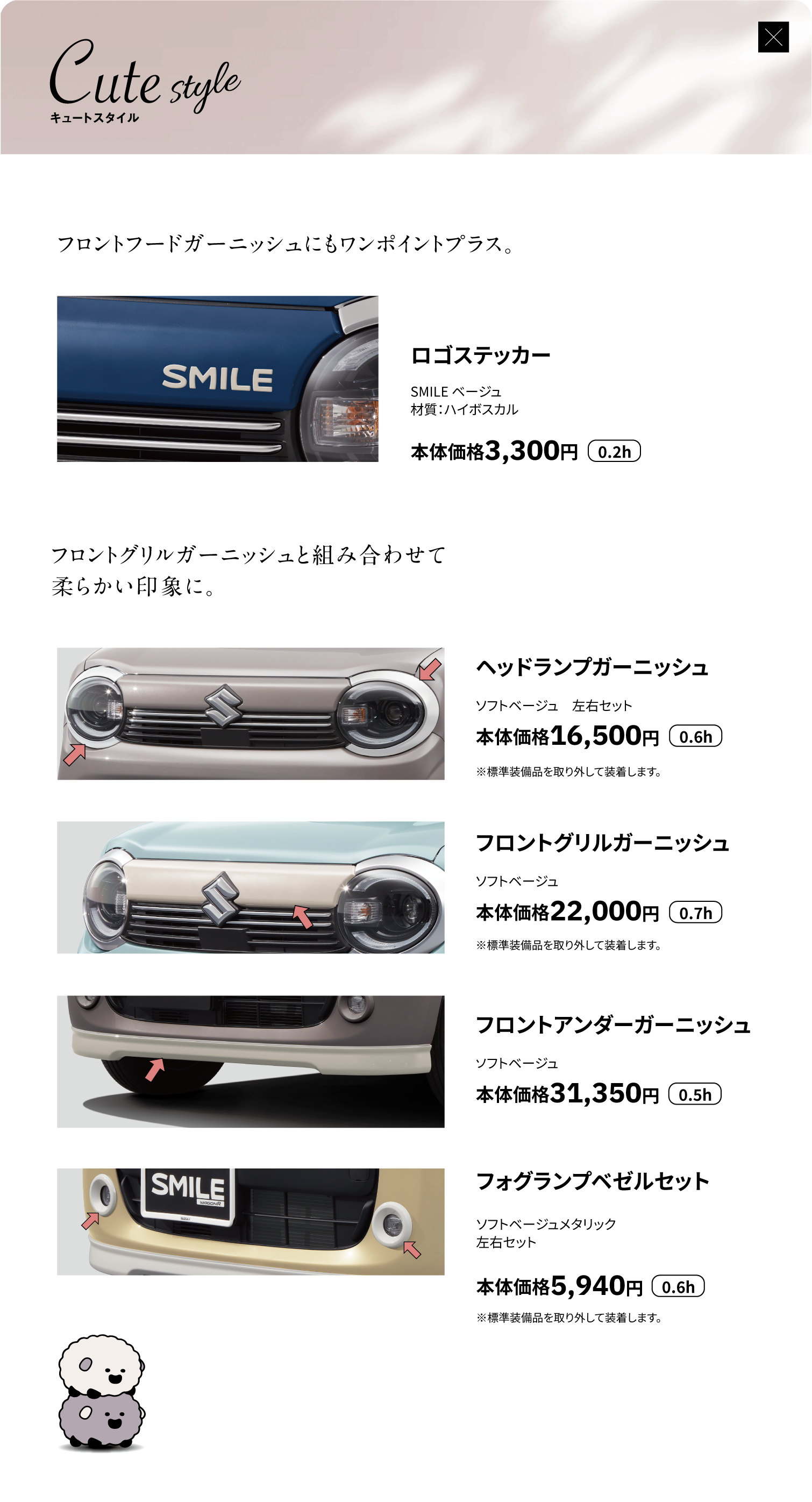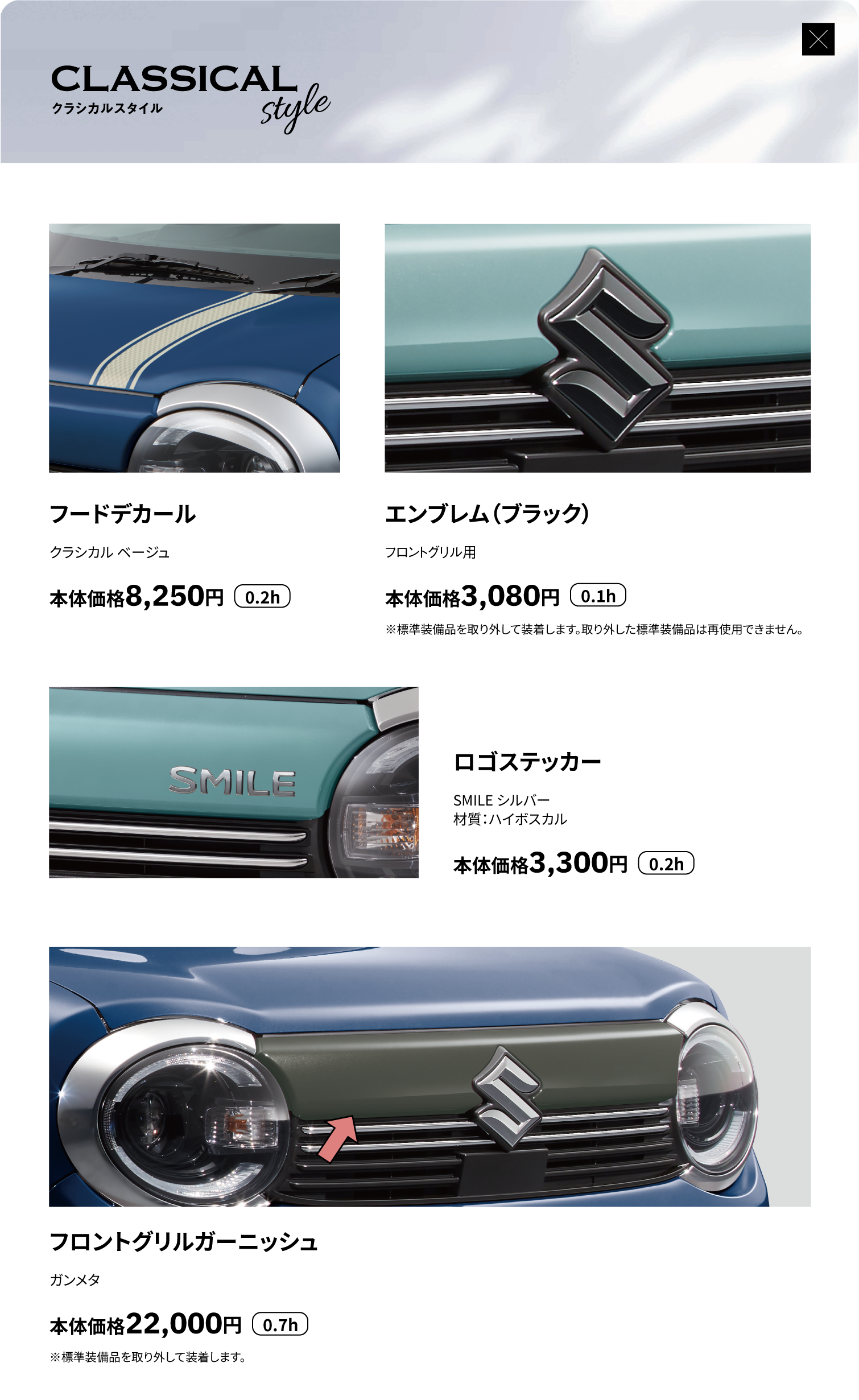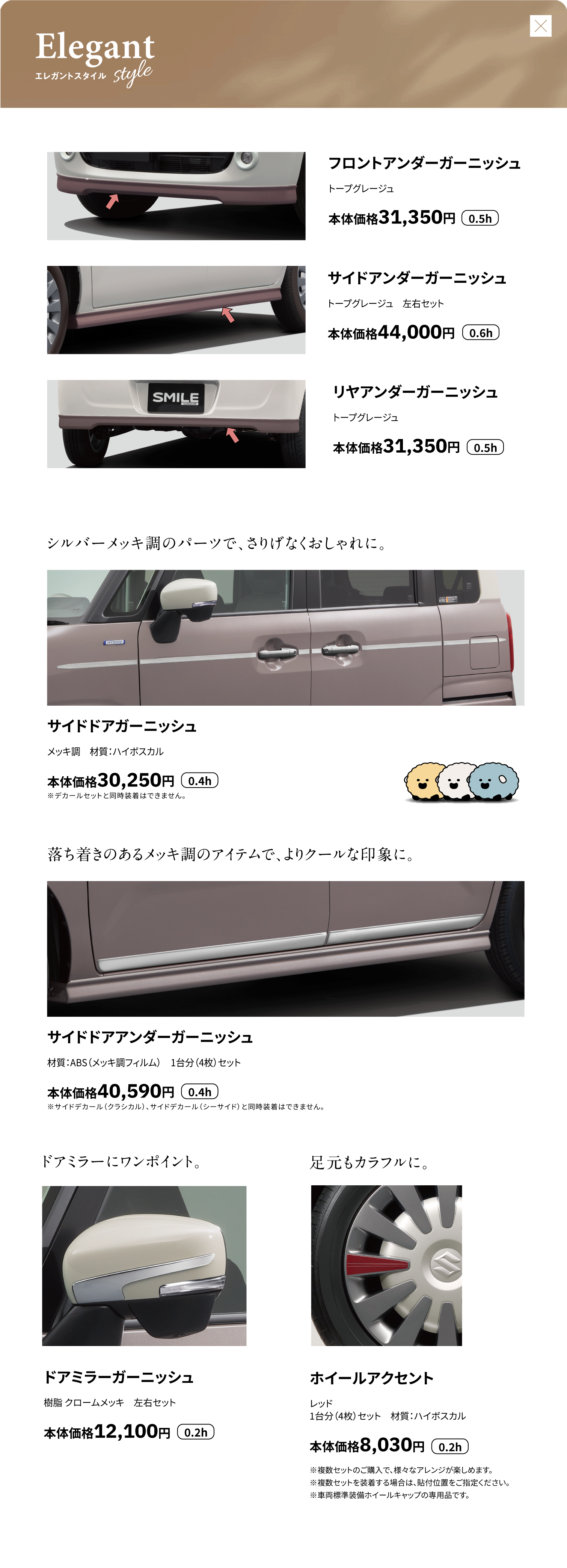 フロントアンダーガーニッシュ、サイドアンダーガーニッシュ、リヤアンダーガーニッシュ、サイドドアガーニッシュ、サイドドアアンダーガーニッシュ、ドアミラーガーニッシュ、ホイールアクセント