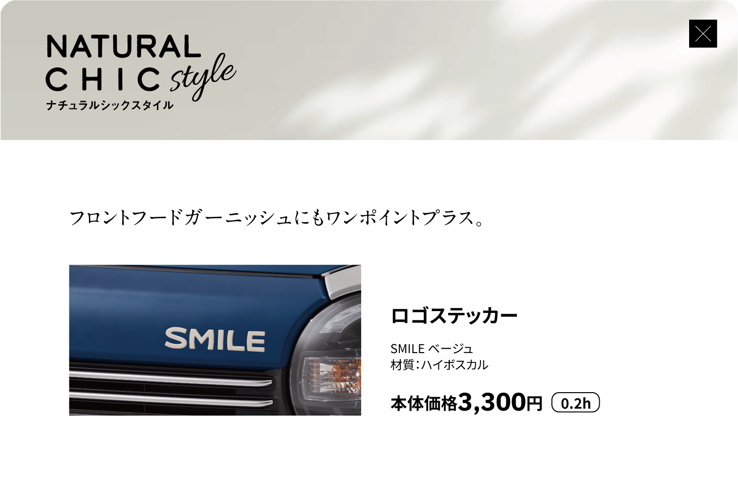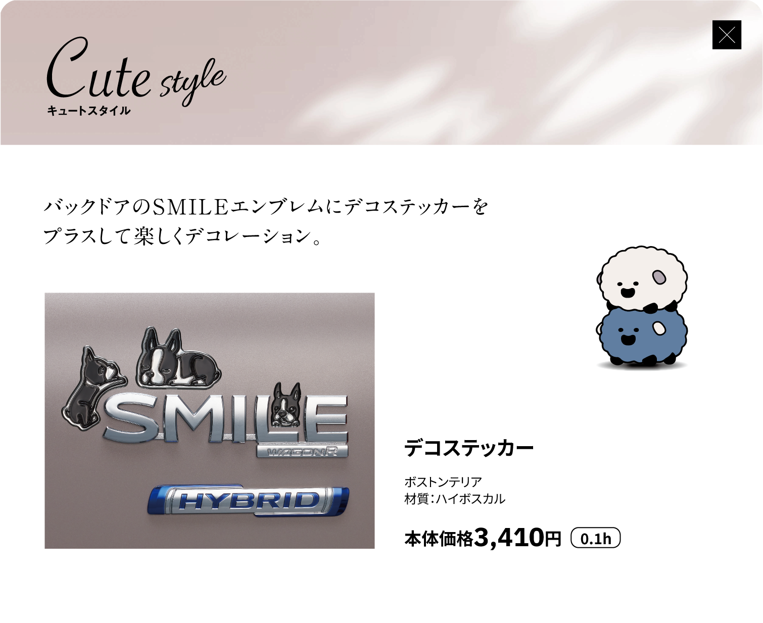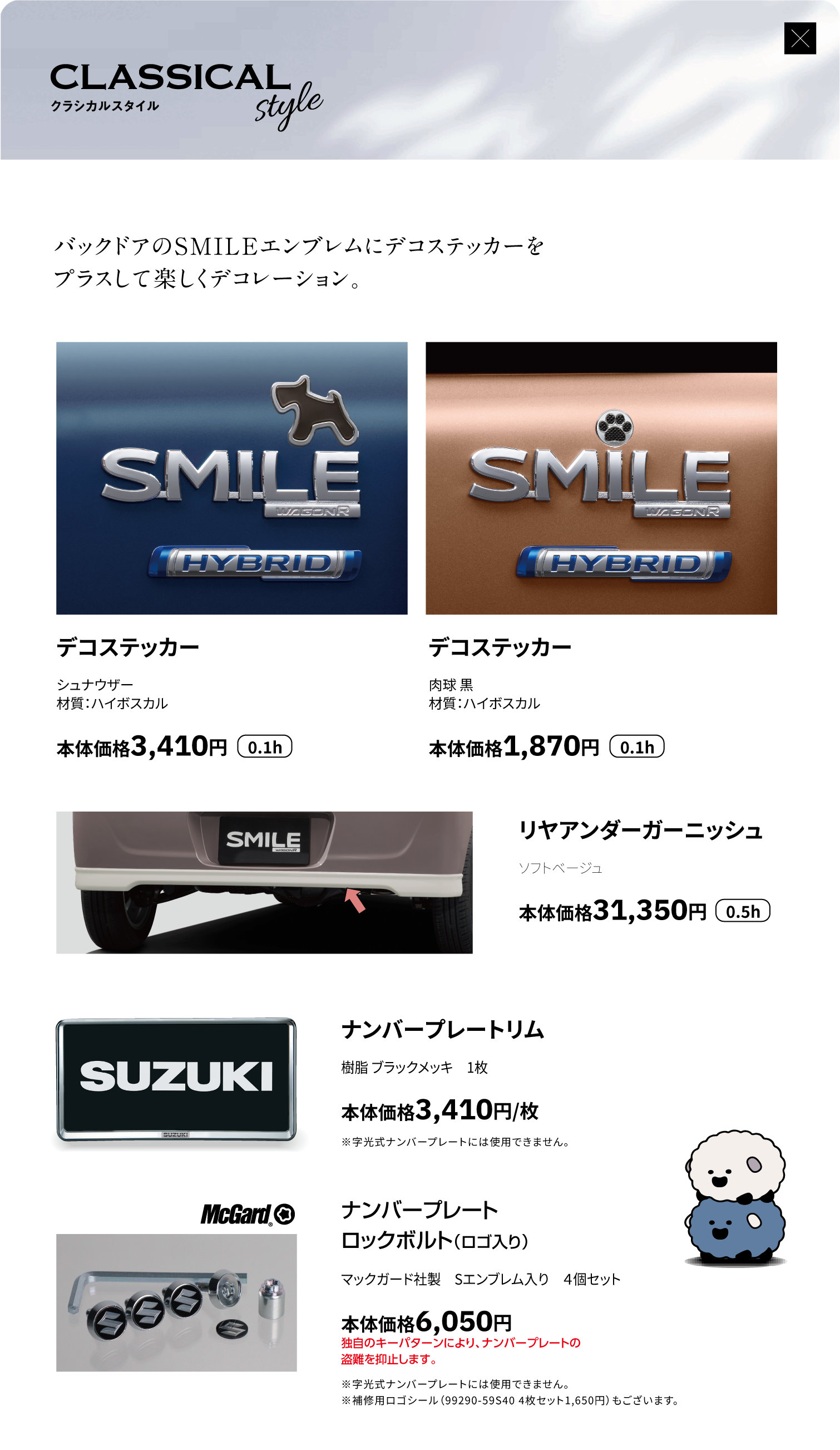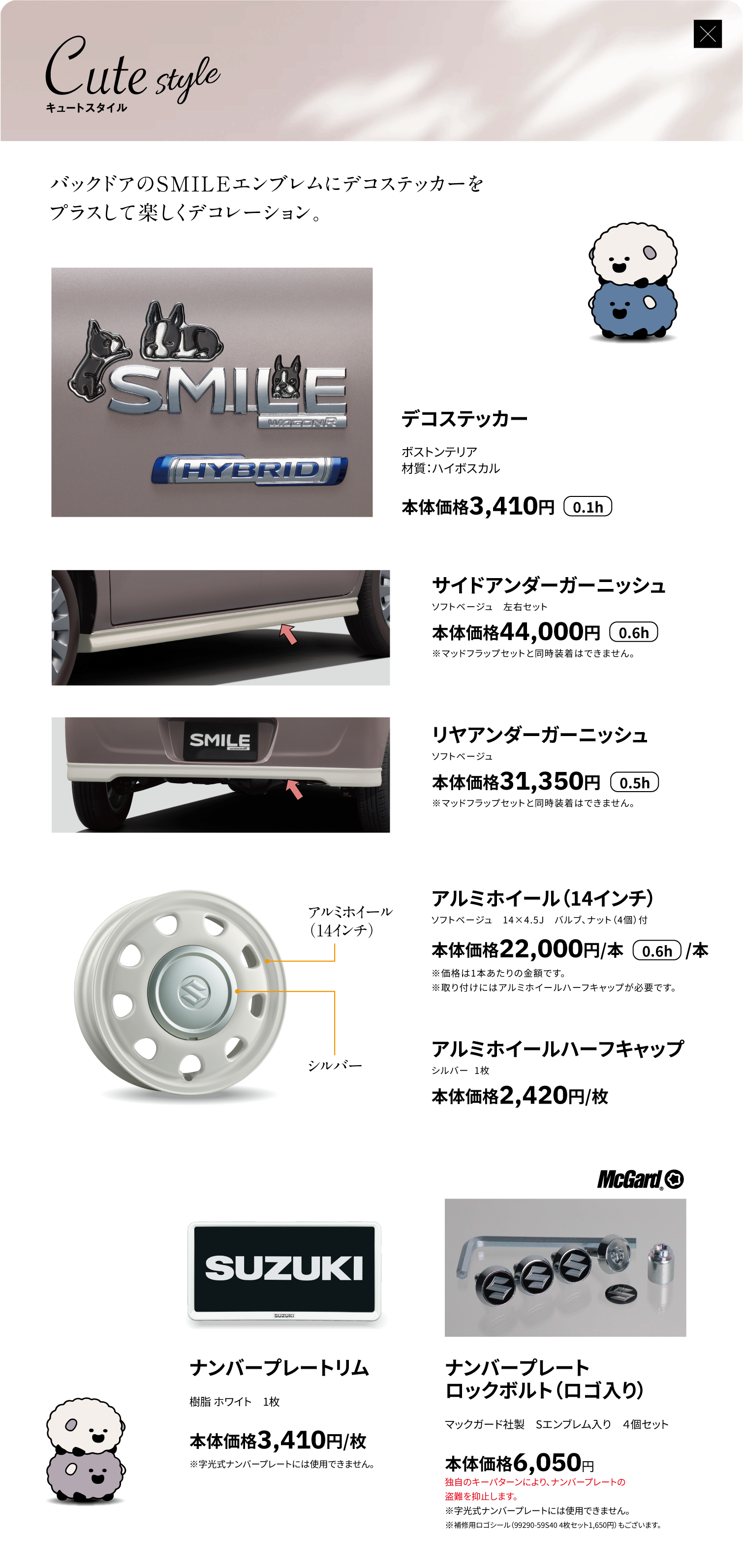 デコステッカー(ボストンテリア)、サイドアンダーガーニッシュ、リヤアンダーガーニッシュ、ナンバープレートリム、ナンバープレートロックボルト、アルミホイール(14インチ)、アルミホイールハーフキャップ