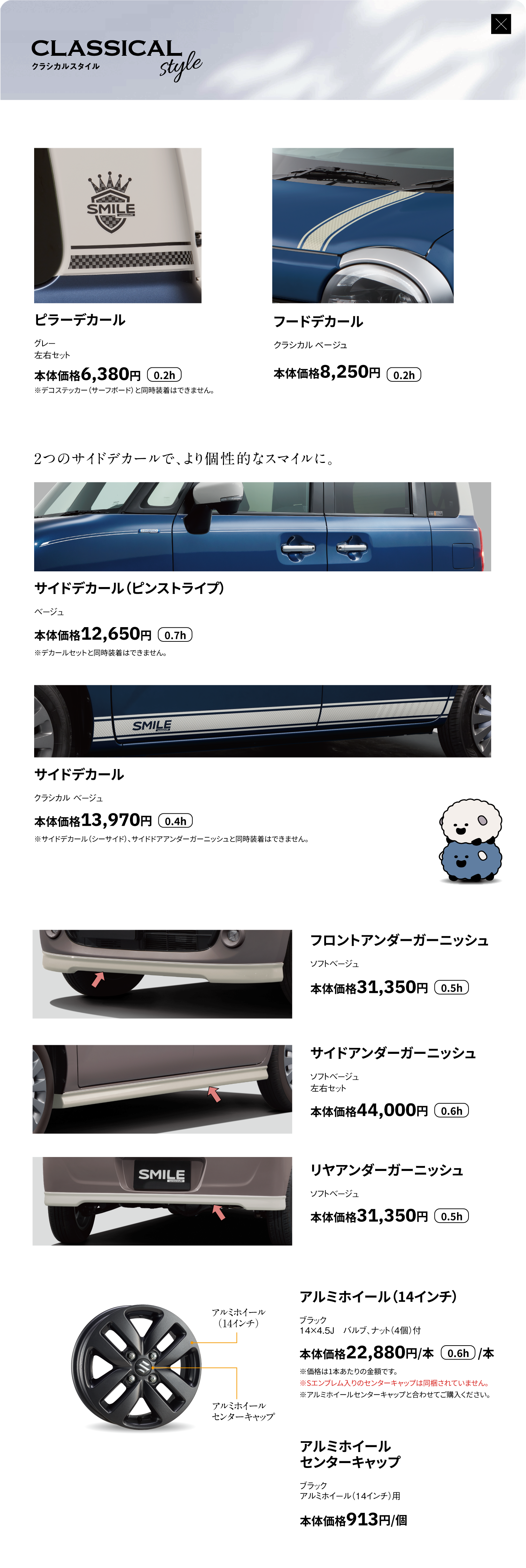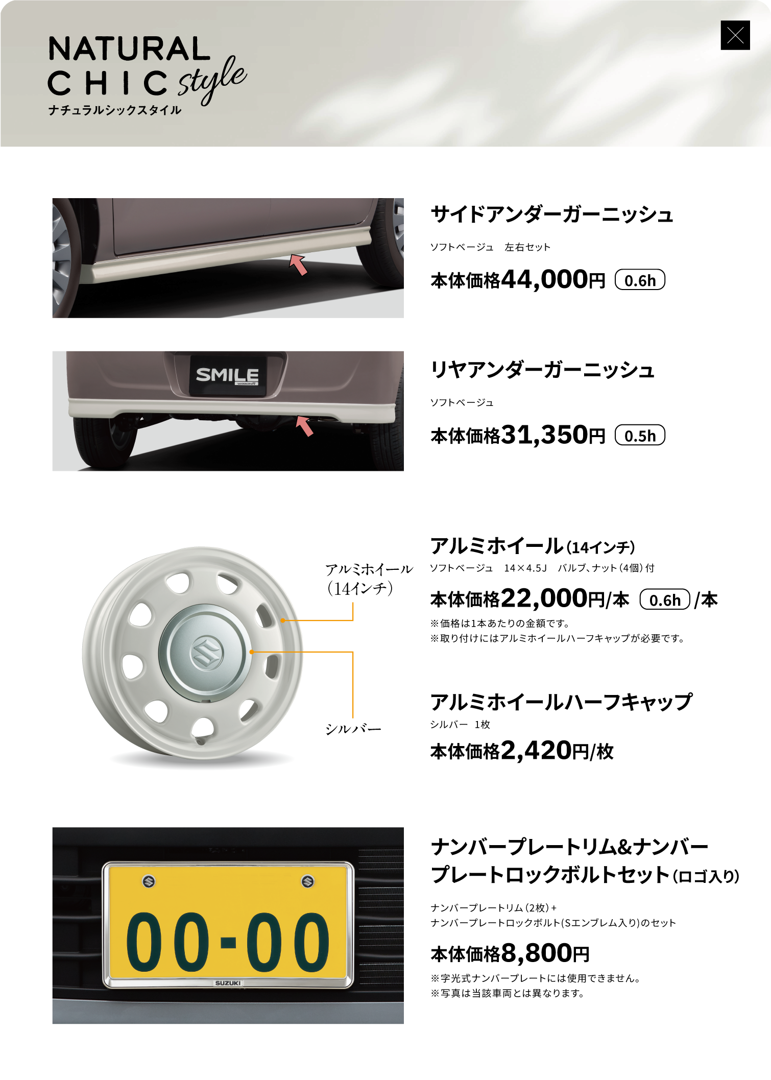 サイドアンダーガーニッシュ、リヤアンダーガーニッシュ、ナンバープレートリム&ナンバープレートロックボルトセット、アルミホイール(14インチ)、アルミホイールハーフキャップ