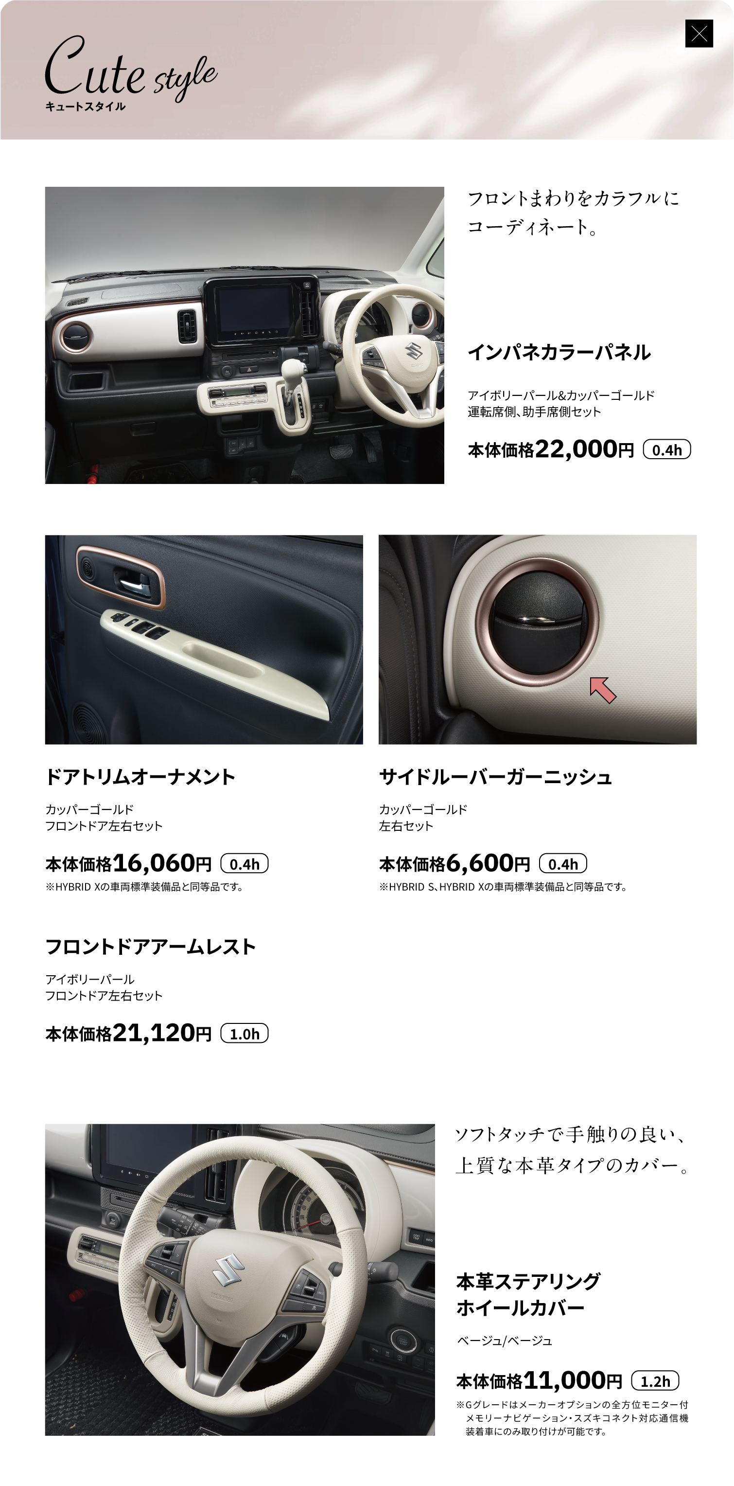 インパネカラーパネル、ドアトリムオーナメント、フロントドアアームレスト、サイドルーバーガーニッシュ、本革ステアリングホイールカバー