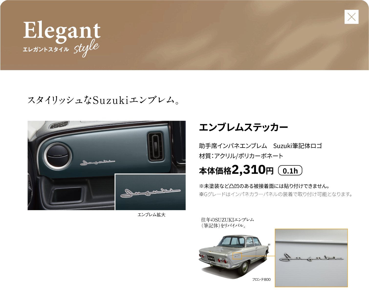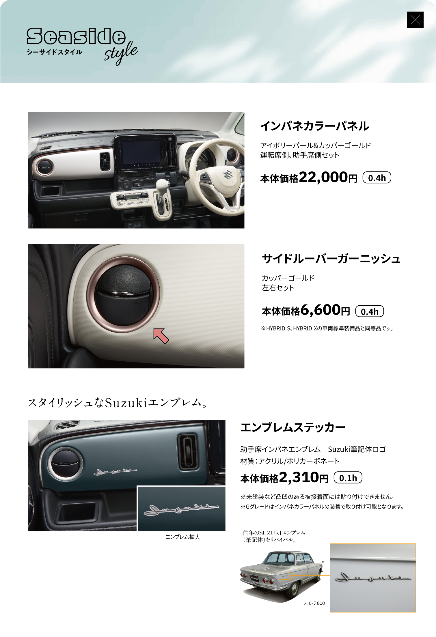 インパネカラーパネル、サイドルーバーガーニッシュ、エンブレムステッカー