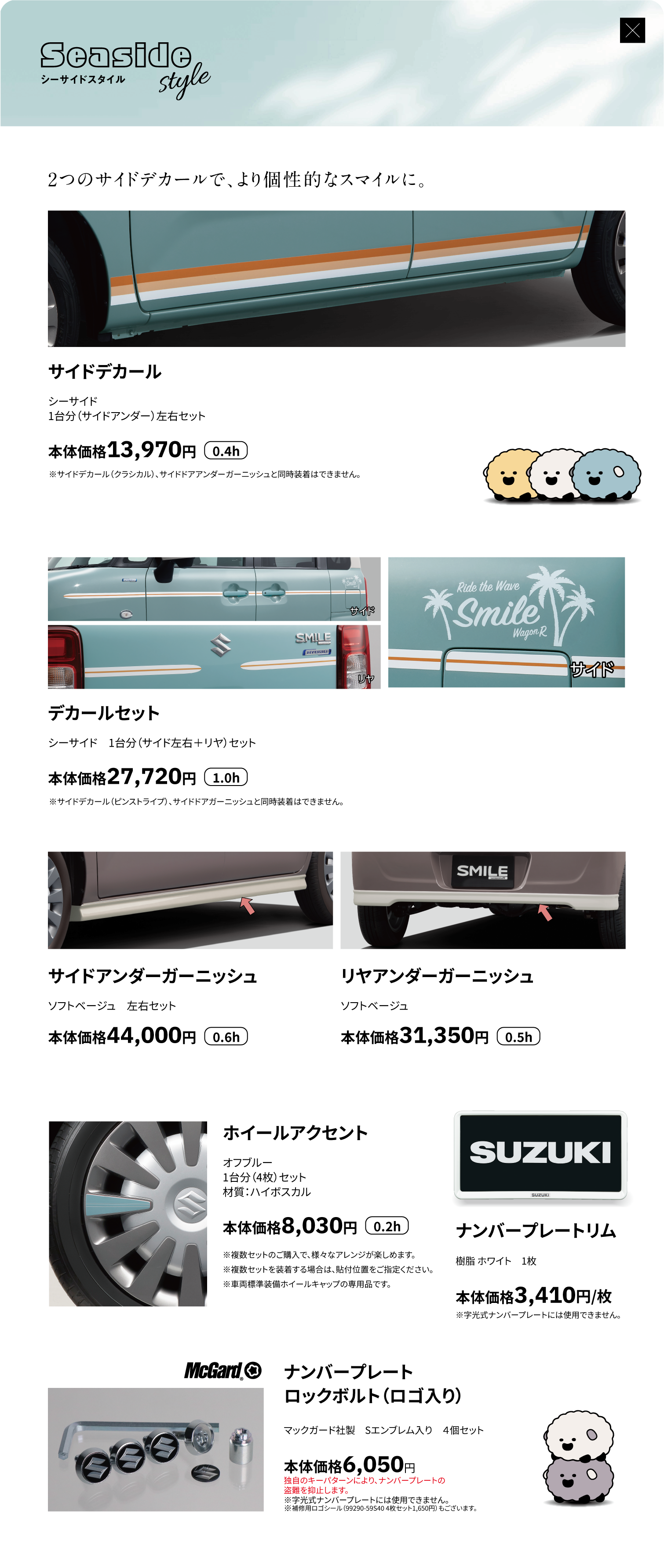 サイドデカール、デカールセット、サイドアンダーガーニッシュ、リヤアンダーガーニッシュ、ホイールアクセント、ナンバープレートリム、ナンバープレートロックボルト